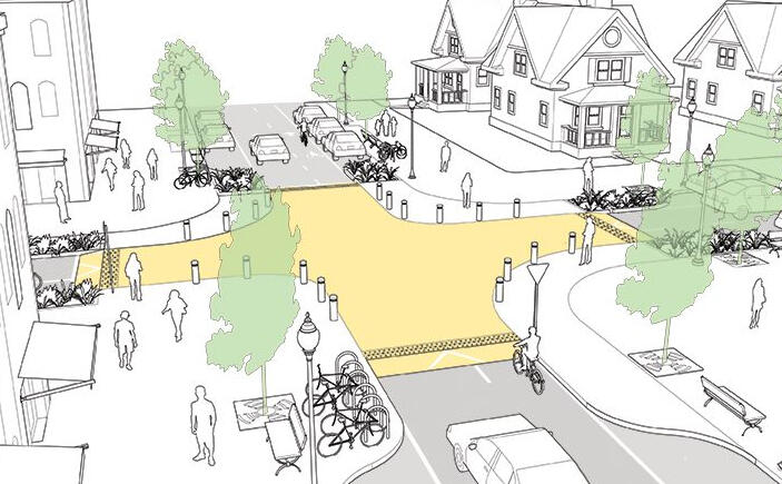 Access to parking for residents on the side streets can be maintained via a paid permit system if necessary to keep vehicle volumes extremely low in the pedestrianized zone. This will make parking for the residents nearby that want to drive easier and less stressful and greatly reduce or eliminate car traffic through residential streets.The pedestrianized core will also function as a central hub for a larger street design network of protected bike lanes and Neighborhood Streets.
