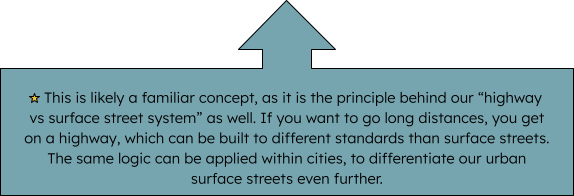 The end result is a “Neighborhood Street” with virtually no motor traffic besides the occasional resident or delivery. This enormously benefits those that live on and near it. Suddenly, the residential Neighborhood Street is far quieter, easier to traverse, and more enjoyable for walkers and micromobility riders. This is how quality of life can be drastically improved for city residents.